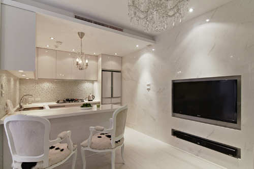 玻璃马赛克色彩点缀下,吧台定位摆上两张法式单椅,随性转向变化了客厅的使用弹性,也有了谈话区的产生。