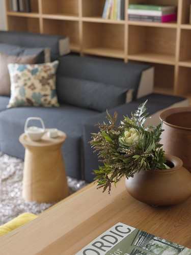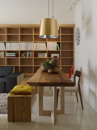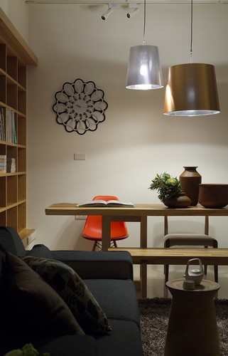 客厅后方的大书柜让屋主完整收纳丰富藏书,也作为客厅设计的主景,简约的家具配置里,设计师特别挑选线条粗犷的茶几画龙点睛出品味独具的现代禅。