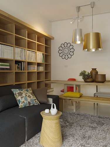 客厅后方的大书柜让屋主完整收纳丰富藏书,也作为客厅设计的主景。