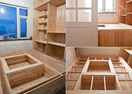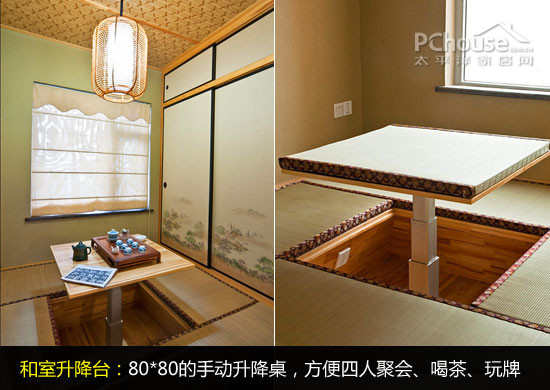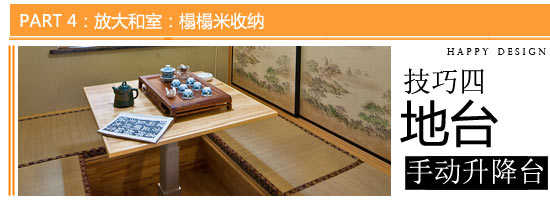 (2)面积小,在地面做了40cm高的地台,用来收纳;地台中间留出80*80cm的升降台,方便喝茶、打牌等。