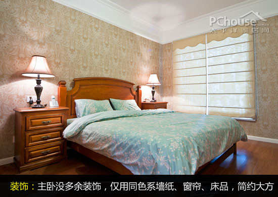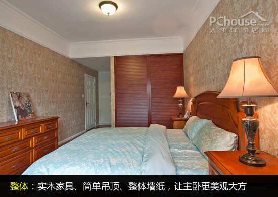 (3)做了吊顶区分主卫、睡眠区。设计以后的睡眠区是个方正的整体,配上淡雅的墙纸,非常大方。