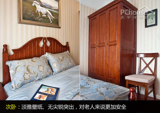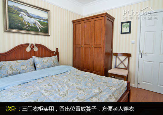 (5)次卧室主要是作为父母房兼客房的功能,只是简单装修,家具的配置也比较简单,用三开门衣柜满足日常收纳。同理,如果是小孩房的设计,也可以这样轻装修、适当重装饰。