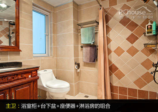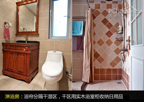 (2)主卫干湿分区,浴帘隔开了湿区的水,干区则用木质浴室柜来增加收纳功能。一般家庭的洗手间只要空间够大,都可以设计这样的经典组合。