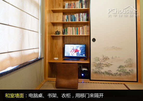(3)也是因为面积小,所以只重点设计了一面墙,左边是电脑桌、书架,右边是定制的衣柜。柜子设计了两个移门,平时可以遮住衣柜,在这里办公。来了客人,可以遮住整个柜子、电脑桌,当客房。