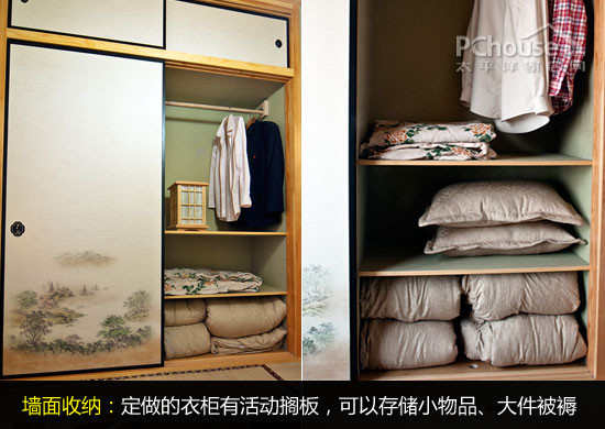 (4)衣柜内部用墙纸装饰,设计了可调整的活动搁板,能存放各种体积的东西。
