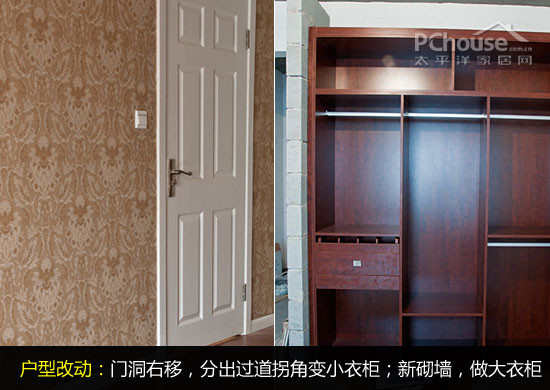 (2)大衣柜左边的墙是新砌的,与主卫那面墙形成一体,浑然天成,缓和主卫门改在右侧墙的视觉效果;小衣柜刚要充分利用过道那个死角。