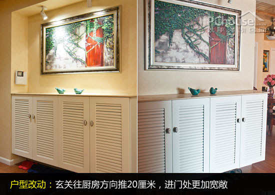 (1)玄关没有直冲客厅,从风水上来说很不错。但是从门到墙的距离是130公分,有一点点压抑,于是设计为向厨房内推30公分做鞋柜,这样,玄关处就会显得宽敞得多。同理可用于向厨房、餐厅、客厅、洗手间推进,网友可根据自身户型特点来设计。