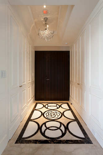 挑选来自于意大利的皇家金花石材,内敛细致的特殊色泽,搭配水切山茶花图腾,预告场域氛围的华丽高雅。