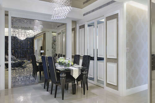 空间量体,是装载幸福的最佳容器;无价回忆,是数不尽的生活经验累积。将新古典风格融入了奢华些许,让屋主珍藏纪念的展示品,重新界定视觉重心,以夹纱玻璃搭配律动感十足的入门动线,在回避了风水疑虑的同时,让场域氛围多了几分活泼轻盈,框景式的主视觉面,表达了客厅空间的磅礡大器,在大理石、线板和茶镜的铺陈衔接下,感受空间的奢华自信。藉由镀钛板与茶镜喷砂的精采表现,在放大视野感受的同时,一并呼应整体风格的延续性,厨房空间透过双开形式下的门片划分,展现新古典中的对称原则,天花板镜面的灵活运用,体验全新思维下的大宅尺度,在局部点缀的马赛克拼贴中,迷恋专属此刻的独享浪漫。
