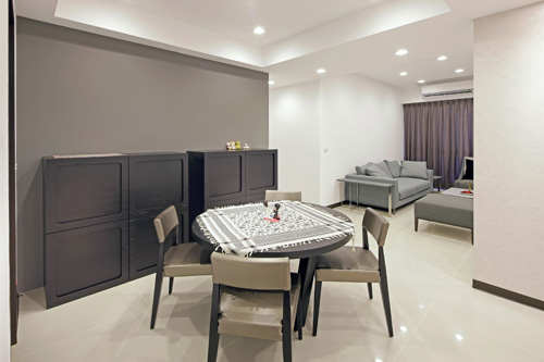早在客变阶段,蔡昀璋设计师针对屋主的使用需求,进行格局的重划与再造,将原先次卧空间的墙面退除,以开放式的多功能书房,绽放机能运用的无限可能,刻意不将柜体做满,利用展示台面的巧妙安排,让生活回忆妆点每个创意角落,而导角斜切式的桌面表现,在家的温馨氛围中,感受迷人的细致品味。利用主题式的电视背墙,将空间焦点重新界定,让机电设备退居在侧,维持主视觉面的清爽简洁,藉由天花板局部的层次表现,不仅保留了完整屋高,更将吊隐式冷气机婉转修饰,柔和适切的间接照明,让人不自觉地忘却大梁压迫的存在,而贴心的画轨安排,成就空间的百变表情。