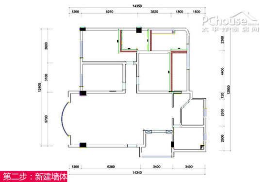 红色为准备新建的墙体,改造后主卧相通并相连衣帽间和卫浴间,显得空间独立又方便使用;次卧扩至阳台面积增加;改变厨房开口更有利于采光通风。