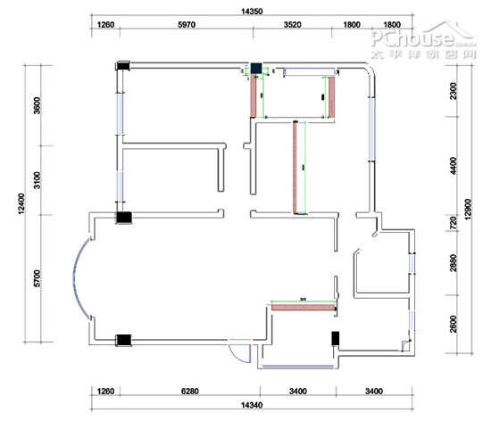 红色为准备拆除的墙体,涉及3大空间:主卧衣帽间的增加、卫浴打通合并一小部分阳台;次卧扩大至阳台;以及厨房开口方强的改变。