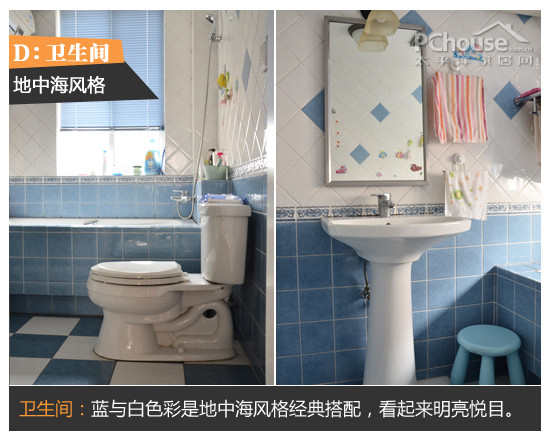 卫生间:蓝与白色彩是地中海风格经典搭配,让卫浴看起来明亮悦目。