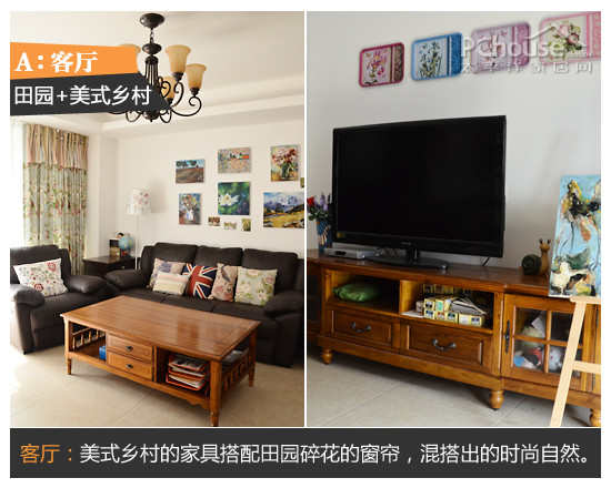 客厅:美式乡村的家具搭配田园碎花的窗帘,混搭出的时尚自然。
