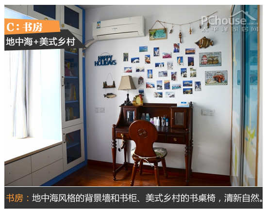 书房:背景墙和书柜营造了浓浓的地中海风情,清新明快,而美式乡村的书桌椅又很好了彰显了书房的沉稳和质感。