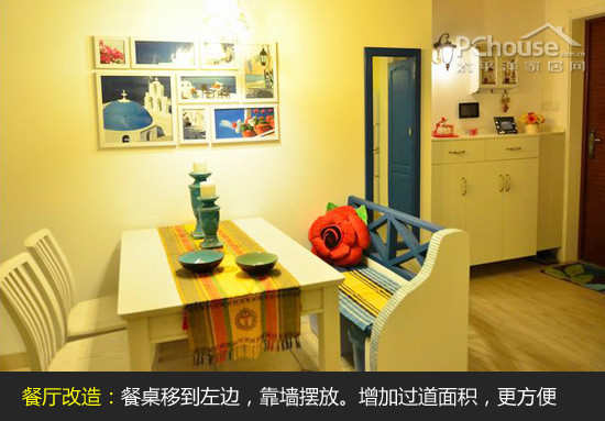 (3)餐厅左移:右边设计了开放式厨房以后,把餐桌左移,靠墙摆放。这样过道就显得更加明亮,行走起来也方便。