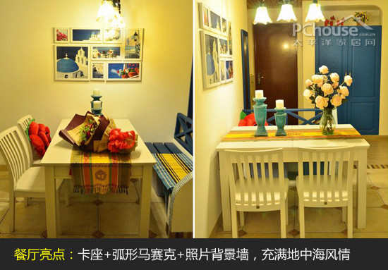 (3)餐厅卡座设计:把餐厅固定在左边,定制了蓝色的卡座,和照片背景墙搭配,非常大方。