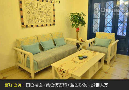 (4)地中海风格客厅装饰:业主喜欢“非典型”的地中海风格,在客厅设计的时候,用不同明度的蓝色来装点空间,有地中海的浪漫,又不流俗,符合业主的审美。