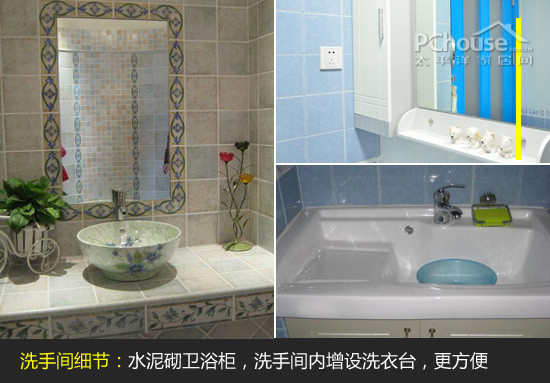 (5)洗手间细节设计:房子只有一个洗手间,为了照顾人多时候的实用性,洗手间内部干湿分区,同时在门外设计了一个洗手台;方便来了客人时候使用。