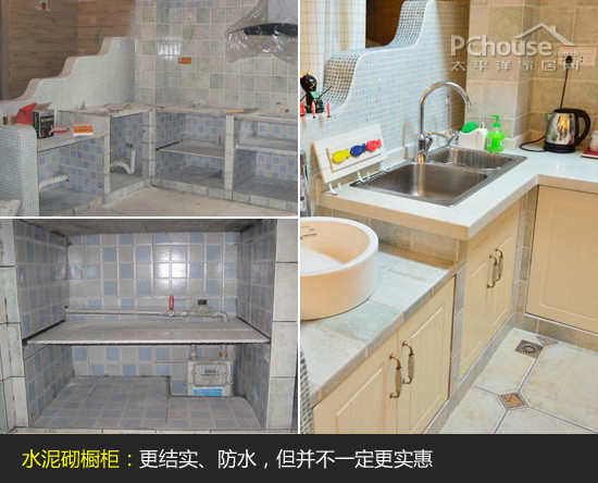 (1)厨房橱柜定制:业主做的是水泥砌的橱柜,台面、门板等外包给橱柜公司。这样做的好处是更美观、更结实、更防水,但是因为造型较多,所以价格并不比整体橱柜实惠,网友们如果要做水泥橱柜的话,做最基本的造型就好了,还要计算好成本。