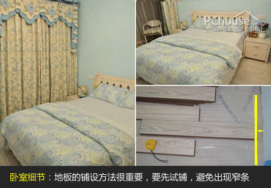 (4)卧室地板铺设:木地板美观耐用,铺设方法也很重要。工人在开工之前,业主要让工人先试铺一条,避免门口、墙角地方出现小窄条(不美观、不耐用)