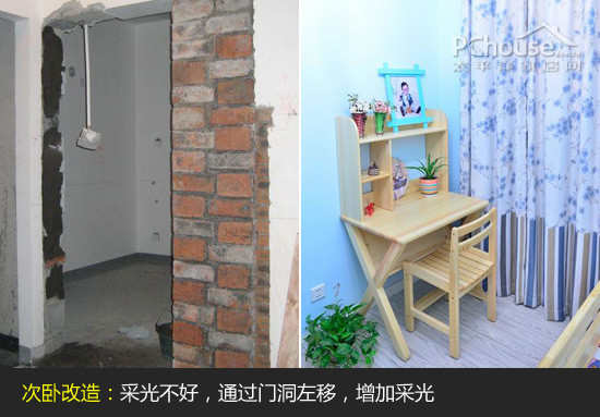 (4)次卧改格局:次卧本身采光不好,是一个内陷的拐角。把次卧左侧墙敲掉以后,右侧再补砌,与主卧门对门,光线更加好。