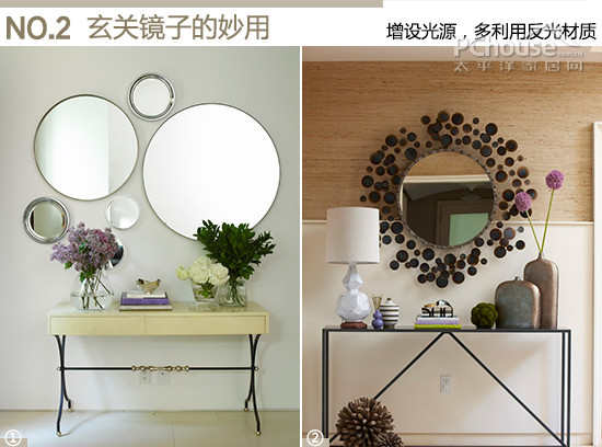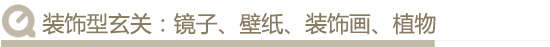 可以在玄关一侧的墙上挂一面镜子,或不加任何修饰的方形镜面,或有艺术镶边的装饰镜,不仅可以让主人在出门前整理装束,还可以扩大视觉空间,可使玄关看来显得更加宽阔明亮一些。