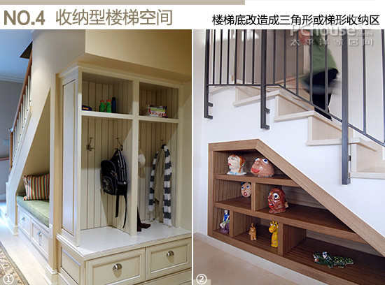 在有些小户型中,楼梯间占了玄关很大空间,对于顶端的不规则区域,我们可从家居收纳着手,根据楼梯间高度,安装多抽屉收纳柜,墙壁加以收纳挂钩,或是摆放一个斜三角形、梯形的大柜子,既能存储不少东西又能显得小巧精致。