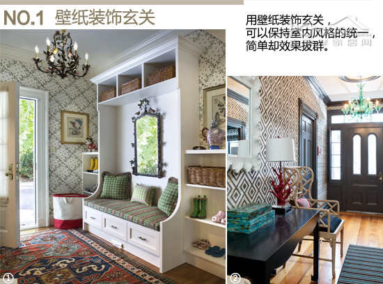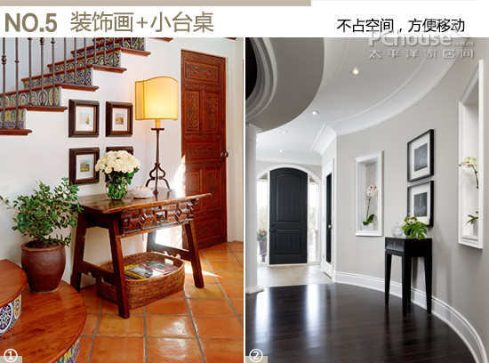 在家具上,小台桌非常适合放在玄关,桌面不宽,并且能倚墙而立。其上挂几幅装饰画,再配上一对装饰用的台灯和植物,效果相当不错。如果玄关面积够大,还可选用圆弧形的壁桌,更显华贵气质。