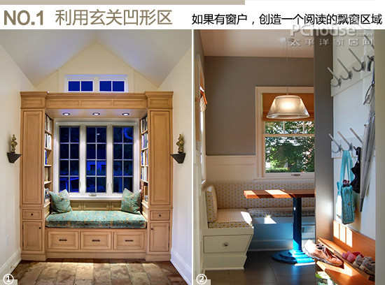 如果在进门后的墙侧有一个凹形区域,就会十分尴尬。而对于小户型来说,再小的空间也不能浪费,只需巧妙设计,每个小户型家就能拥有更多的收纳空间。如果有窗户,可以创造一个阅读的飘窗区域。