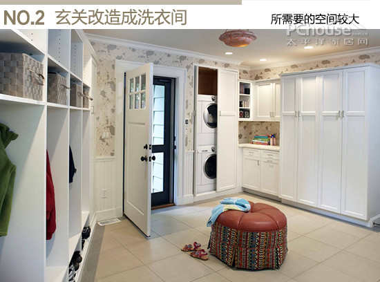 除了一侧的必备大型玄关收纳柜外,玄关另一侧摆放衣柜。摆放洗衣机的柜子可以采用内嵌的设计,柜门拉开后可以垂直内推到柜子里,空间利用率非常高,而且绝对不阻挡人进出玄关。