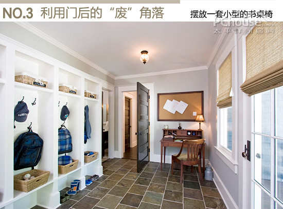 门后的角落不大,通常摆放不了大型的家具,而且容易受开关门的影响,所以很多人都会放弃这个畸零角落。其实可以在门后摆放一套小型的书桌椅,就成了一个小小的学习区域,做到“废”空间的巧利用。