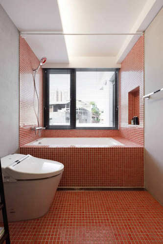 以日式汤屋的手法规划,设计师贴心的安排集层材踏几,方便进出浴缸时使用。