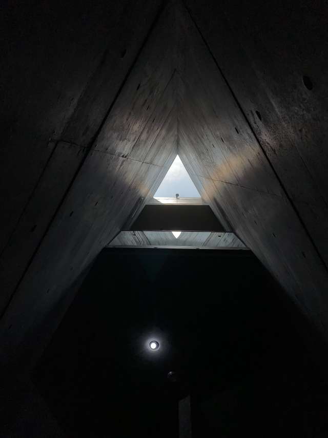 此馆以三个角度错落的三角量体作为设计概念,共分为三个楼层,包含展场、设备与公共空间,安藤将正三角形的平面分割成三层,由于错落堆栈的关系产生无数个三角形。在三个三角形楼层迭合的中央地带,留下如天井般的空间与采光,让雨水直接落下,相当大胆且诗意。