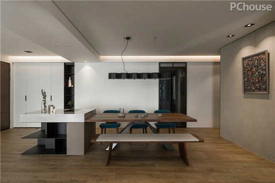 编辑点评:由吧台与餐桌所组成的开放式餐厅,成为公共空间的第二个亮点。吧台配有电磁炉,可以简单烹调轻食。