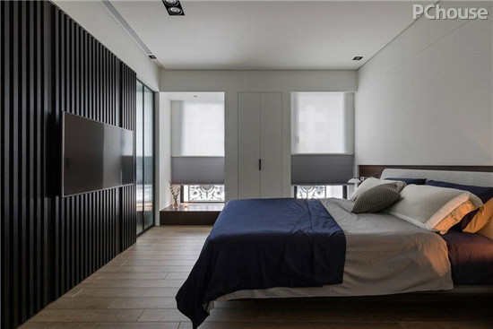 编辑点评:更衣室采玻璃拉门设计,保留主卧室充沛采光条件,特别挑选直条纹样玻璃,与一旁格栅电视墙相呼应。