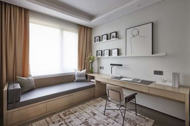 沿着餐区旁的廊道转入多功能房,场域转以木纹作为叙事主调,在明亮的天幕设计下,浅色的桌椅及坐榻,最后由散发安稳底气的木纹地坪承揽收束。透过大面开窗流淌入室的日光,塑造淡雅空间的敞朗感受。临窗设置的定制坐榻与书桌相连,采用同样色度的木质面材搭构出清新视感,让家人既能独坐桌前阅览书报,亦可闲散地卧于窗榻,静享私人时光,将艺术化的生活面貌就此实现。