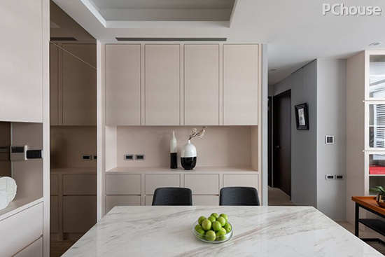 另一方面,玄关的米白柜体则转折为洁净的用餐区域,连绵的舒适色度化为尺寸齐备且数量充裕的置物柜,供作刀叉碗盘的新家;而其中一侧更细心设置大幅茶镜,迎纳透窗而入的舒缓日光,进而使光线反射至公领域的各个角落,打亮日日起居坐卧的开朗心境;而每当夜幕升起,带有淡彩纹理的石制桌板亦彷彿承接白昼的余绪,为聚拢佳肴的餐碗拌入简单日常的好滋味,让一家人带着愉快的心情用餐,饱尝满腹欢快。