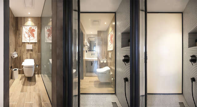 卫生间干湿区通过整面玻璃隔断分隔,两个区域分别有独立的换气系统