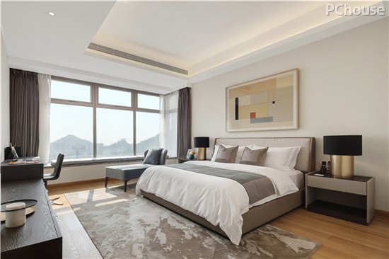 卧室更多是为了表达居住者的情调与心境。这里的安排更像是一种温暖的、治愈的生活仪式。沿用了客厅一样巨大玻璃窗,搭配高雅清幽的高级灰调背景,简约、明净,无需过多色彩点缀,“生活”的氛围便有了。