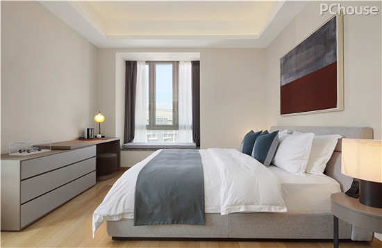 纯白、砂灰、原木达成了一种诗意的联通感,如此慵懒而和谐的空间中,睡眠空间的舒适感被无限放大。