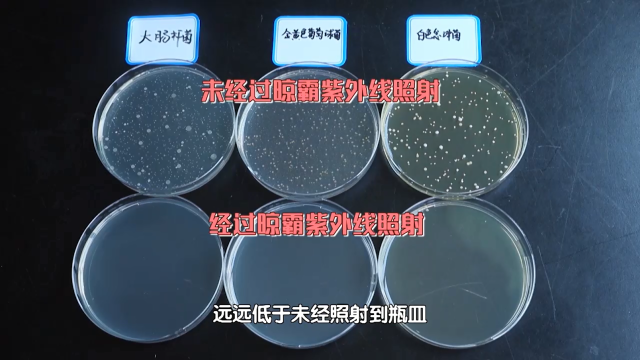 在专业的实验室中,实验员将金黄色葡萄球菌、大肠杆菌、白色念球菌制成菌片,放到晾霸极光Q4声控除螨晾衣机上进行紫外线灯照射杀菌,另一组则不进行紫外线杀菌。