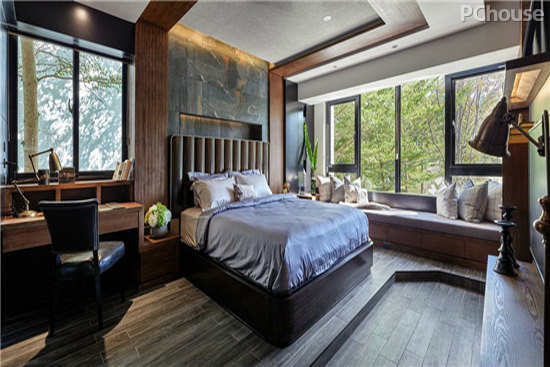 编辑点评:以屋主儿子喜爱的简约禅风为基调的空间设计,以带有粗旷阳刚味的仿板岩磁砖做为床头背墙,别具巧思的床头及书桌区的灯光设计,为空间注入温馨氛围。