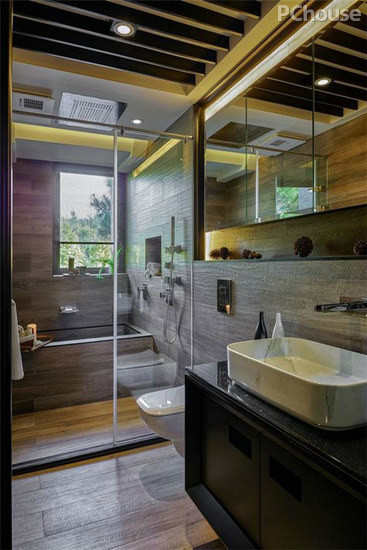 编辑点评:以温暖的木纹砖铺陈空间,营造仿佛置身日本汤屋的度假感,简单俐落的设计线条,展现男孩的精致品味。