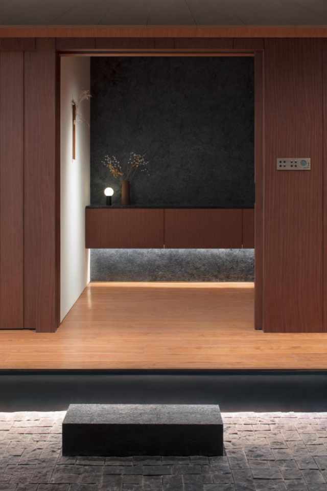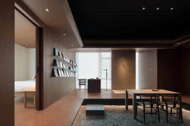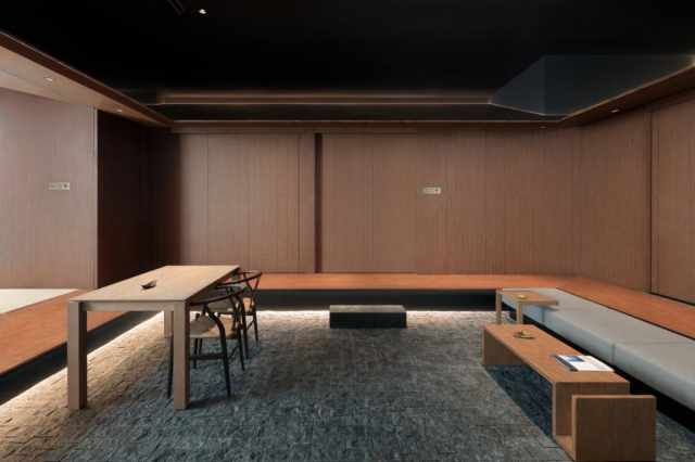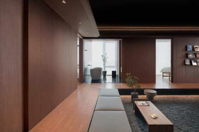 在竖向高度允许的条件下,我们为排布在四周的房间设计了一圈室内屋顶,屋檐出挑,又对院子以外的地面空间进行了抬高设计处理(高度是沙发的高度,人们可以舒服的坐在上面),在“院子”和房间之间,形成了一种檐下回廊空间,在日本称之为“縁側”。