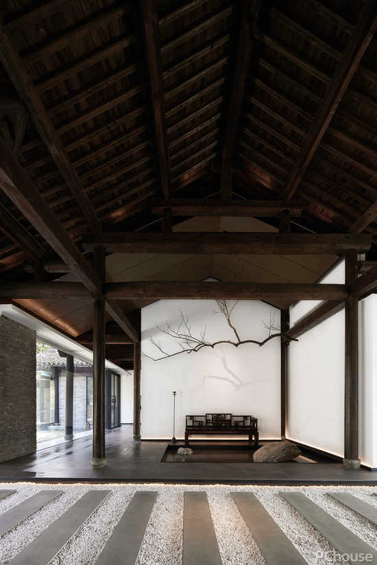 在前厅的另一侧做了一个山水的景观,放上一把古椅,一台烛灯,顶面悬空着一根来自周围树木的树枝,当灯光照射时,白墙上便展现出曲折蜿蜒的投影,西溪美丽景色在室内得到延续,也是无界的理念体现。