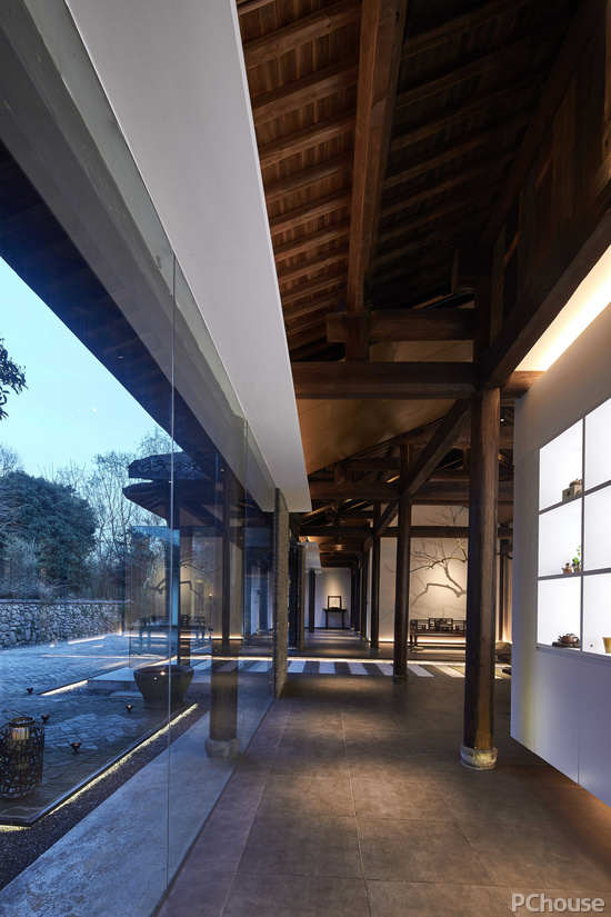 为了让立面自由,白色的墙面、玻璃面、传统木柱之间保持着一定距离,像是某种精神上的对话,产生了距离美。