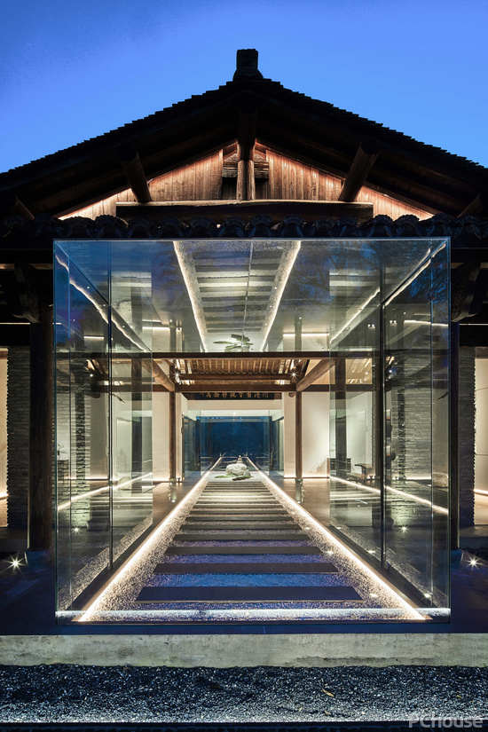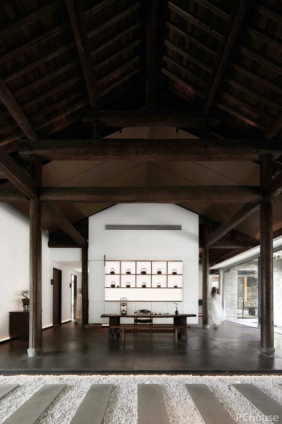 设计师在保护传统柱梁结构的基础的上,为设计做了减法,采用了大落地玻璃,露出建筑本身的骨架,入口处的大玻璃盒子代表了一个无形的界限,既将四周景色与室内空间相互打通,又增强了采光性与通透性。走入其中,有种虚实之间交错之感,颇有佛法中“一切有为法,如梦幻泡影”的意味。