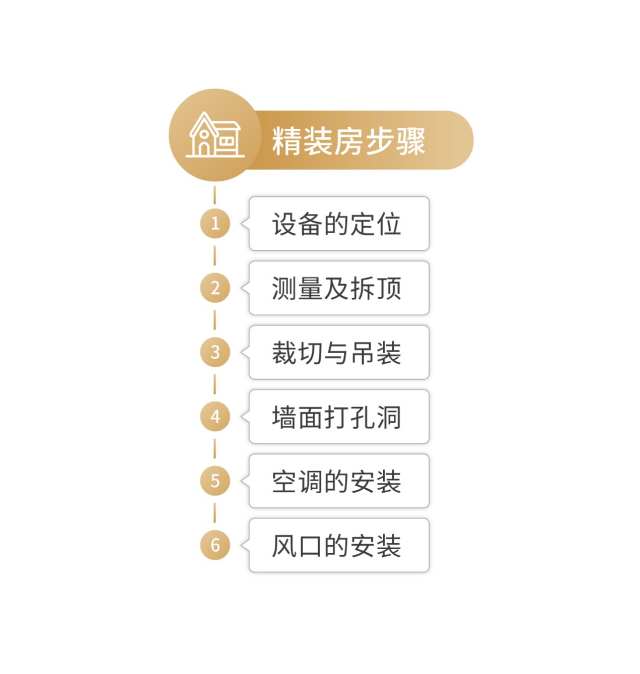 精装房快装日立中央空调免装修方案2.0升级版,本着精工精匠的理念,通过六个步骤,由一组空调安装人员用时约5个小时即可完成操作。