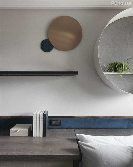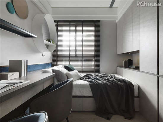 次卧房转而将圆形意象化为机能置物架,设计师于床头主墙规划醒目的圆架及壁饰,将「圆」所具备的圆融完满之气晕散开来,突出的造型亦丰富了狭长场域的视觉动线。自书桌延展而来的床头柜,运用俐落的组合式设计,平顺地承揽视线向外延伸,同时提供充分的置物区域;而对侧壁柜则配合床铺高度,于顺手处设置内嵌置物台,满足顺畅拿取物品的日常需求,使私人领域于简单而美的机能语汇中达致完备。